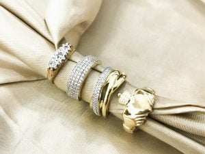 Gold is a highly desirable precious metal. 9ct gold contains 37.5% pure gold and the remaining 62.5% is made up of alloy metals. These other metals mixed with the gold give the material its strength. Rings tend to be worn for several hours a day and are more likely to be bashed or caught on something than other pieces of jewellery. By opting for 9ct gold, the rings are less likely to change shape when the hand naturally heats it up. Rings made from this material are ideal for people who work with their hands a lot as you don’t need to worry about it getting damaged the same way a higher carat ring might.