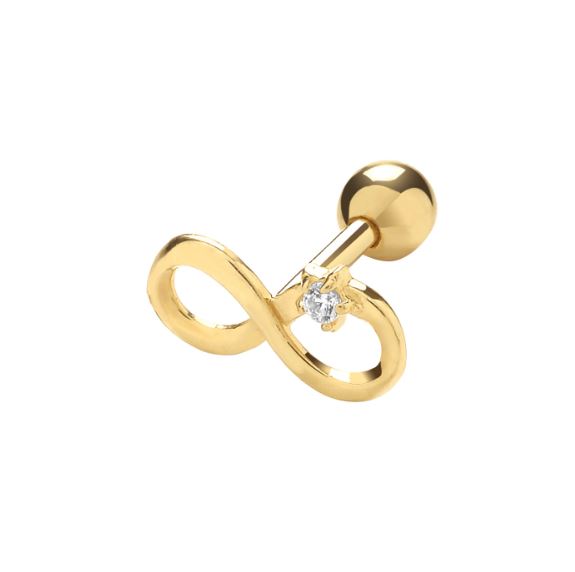 This 9ct Yellow Gold Infinity with Single CZ Cartilage 1.0mm x 6mm Ball Back Post Stud Helix Earring 0.29g is a lovely piece of universal body piercing jewellery. It is suitable for most piercings.