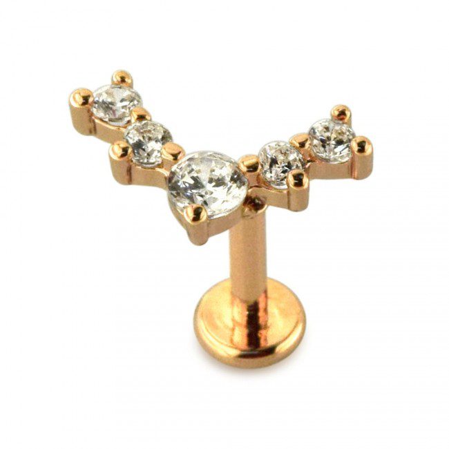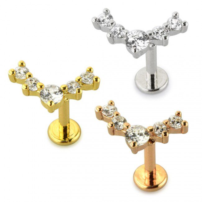 Description:- This ear stud is 1.2mm thick/ 16 gauge and suitable for helix and tragus piercings. It features four cubic zirconia stones which branch off a larger central stone, with two gemstones on each side. The curved shape gives the impression of reindeer antlers, and perfectly fits the curve of the ear. This stud is made from surgical steel and comes in three colours: steel, rose gold and gold plated.