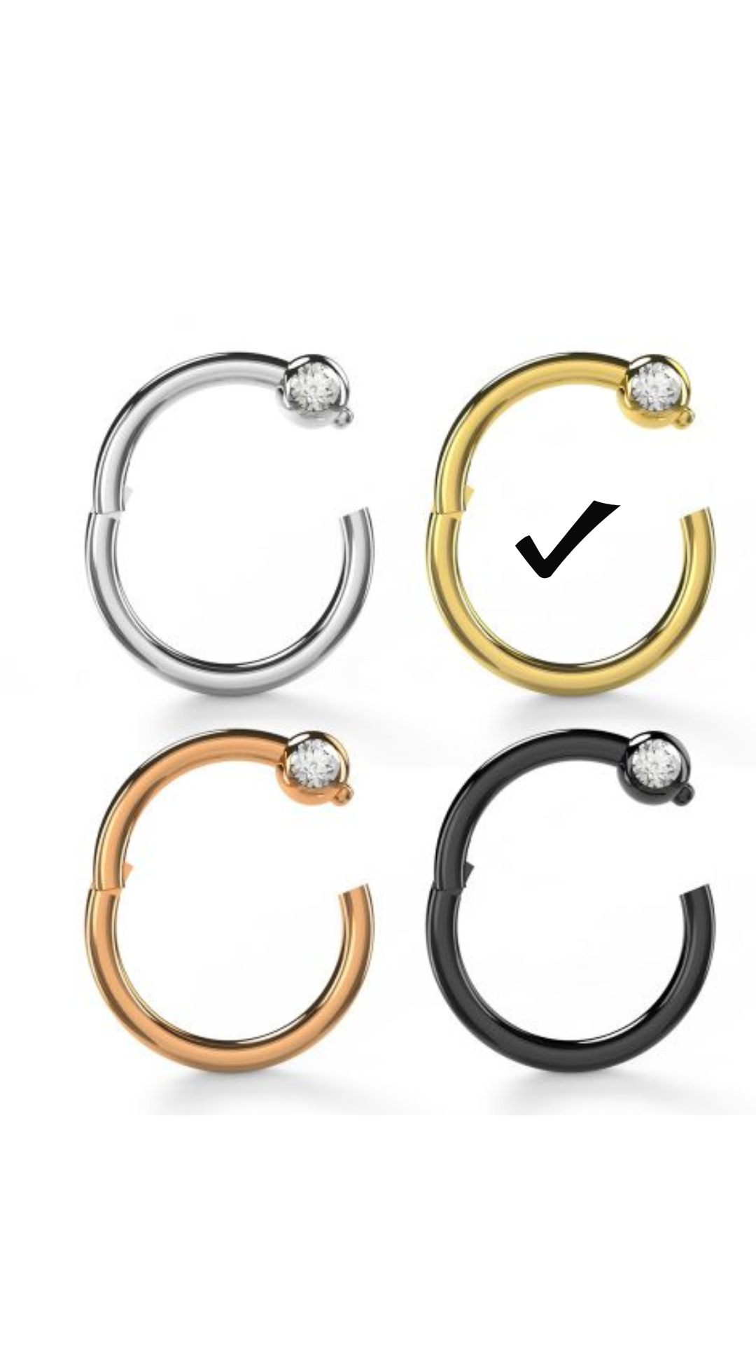The 316L Surgical Steel BCR Clicker Piercing Ring, available in 1.2mm and 1.6mm sizes, is a versatile and durable piece of body jewellery perfect for a variety of piercings, including earlobes, cartilage, and nose. Made from high-quality 316L surgical steel, it offers excellent resistance to corrosion, tarnish, and staining, making it ideal for sensitive skin and ensuring long-lasting wear. The innovative clicker mechanism allows for easy insertion and removal without the need to detach a separate ball, providing a secure and comfortable fit. Its sleek and polished finish adds a timeless and elegant touch, making it suitable for both everyday wear and special occasions. Whether you need a reliable piece for multiple piercings or want to enhance your style, this BCR clicker ring combines functionality, durability, and sophistication.