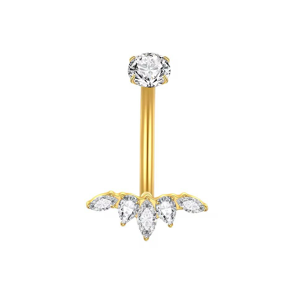 Adorned with sparkling cubic zirconia stones, the bar features a stunning arrangement of gems, creating a dazzling effect that catches the light beautifully. Measuring 1.6mm in gauge and 10mm in length, this belly bar provides a secure and comfortable fit for most piercings. Whether for adding glamour to your outfit or as a thoughtful gift, this navel bar delivers a touch of elegance and sophistication.