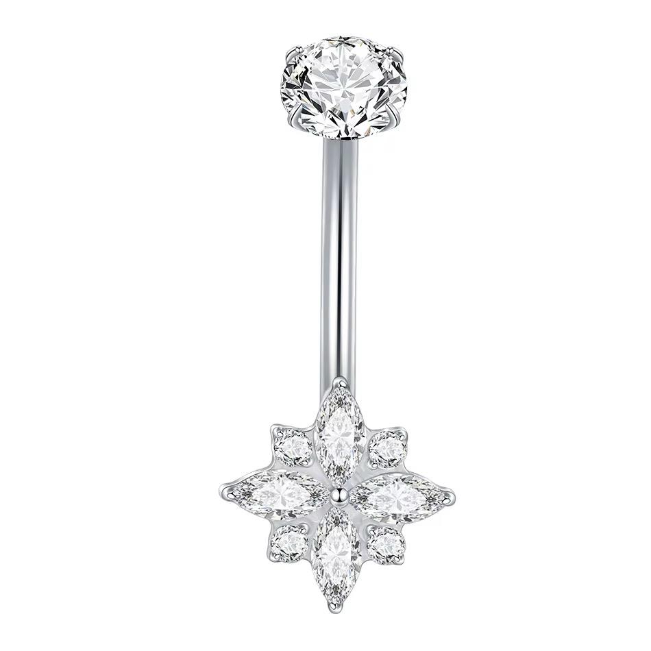 Adorned with sparkling cubic zirconia stones, the bar features a stunning arrangement of gems, creating a dazzling effect that catches the light beautifully. Measuring 1.6mm in gauge and 10mm in length, this belly bar provides a secure and comfortable fit for most piercings. Whether for adding glamour to your outfit or as a thoughtful gift, this navel bar delivers a touch of elegance and sophistication.