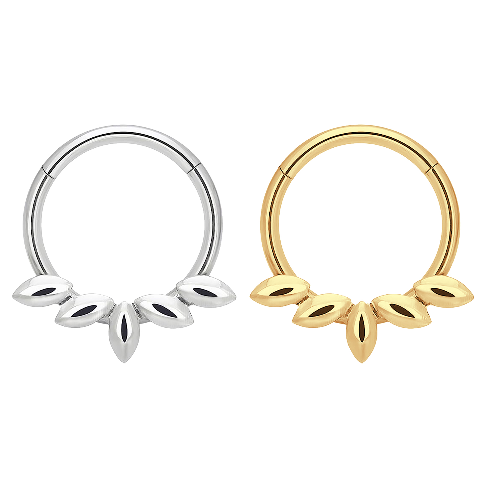 Discover elegance redefined with our New Karma Titanium Clicker leaf design, available in a range of sizes to suit every unique preference and scenario. Crafted with meticulous precision, titanium offers an exceptional alternative to steel or silver, boasting superior durability while maintaining stunning aesthetics. With titanium being 45% more durable than steel, this hoop can withstand the test of time without compromising on its striking appearance. As a preferred metal for piercing, rest assured that any titanium piece, including this clicker hoop, is built to last a lifetime, making it a timeless addition to your jewellery collection. Experience enduring sophistication and quality craftsmanship with our Titanium Clicker Hoop today.
